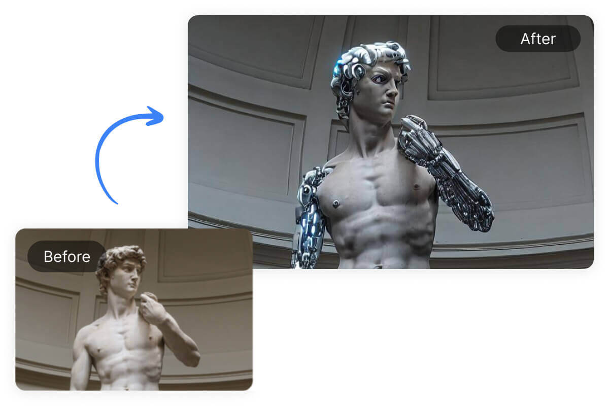 Once uploaded, our AI goes to work. Based on your selection, it can turn humans into cyborgs or robots, add the charm of Minecraft, age or rejuvenate your subjects.